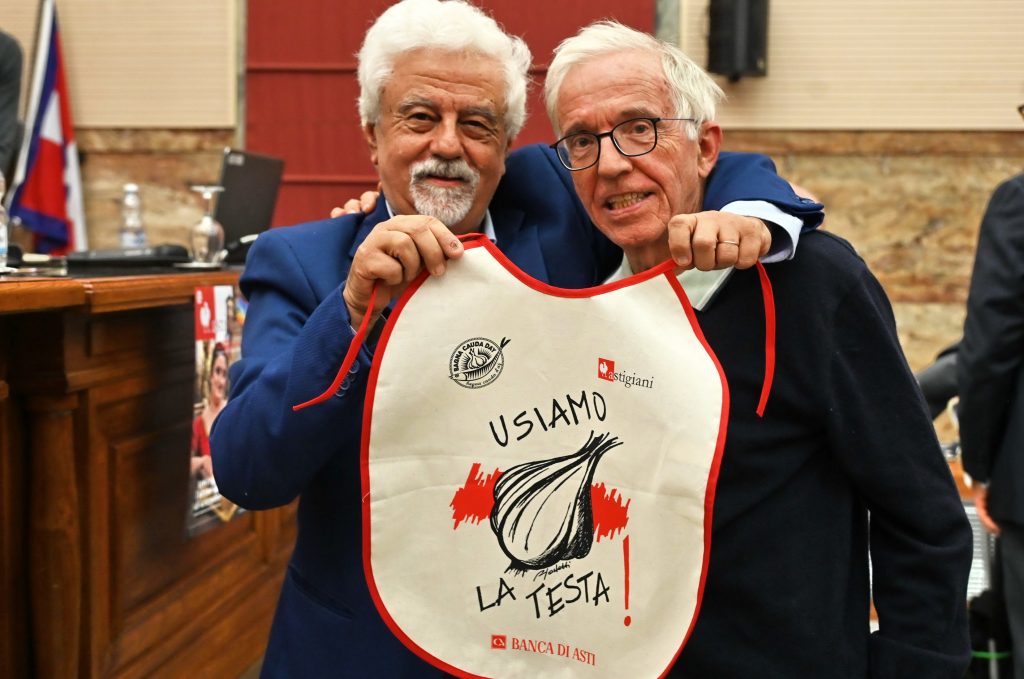 A destra nella foto l’autore del “bavagliolone” 2025, insieme al direttore della rivista Astigiani Sergio Miravalle